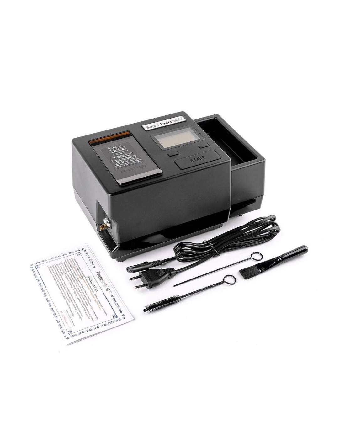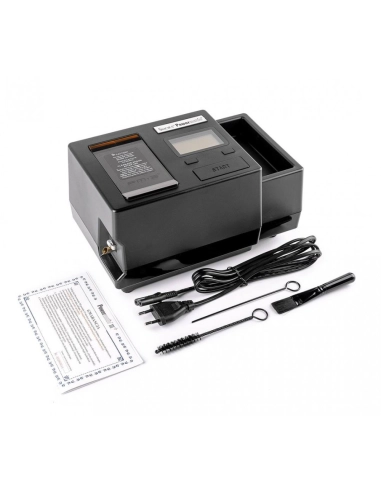 Електрична інжекторна машинка для набивання гільз - PowerMatic III+ Майже повністю автоматизований процес! Щоб отримати ідеально набиту сигарету, достатньо підставити гільзу і натиснути кнопку "START"! Звичайно, попередньо засипавши тютюн у спеціальний резервуар, ємність якого дорівнює приблизно 30 готовим сигаретам! Машинка PowerMatic автоматично завантажує тютюн із резервуара та стискає його. Продуманий механізм утримання та забиття гільз дозволяє набивати будь-які гільзи, від X-Long до 100 міліметрових та має електронний захист від зминання тютюну в камері. Рекомендується використовувати тютюн великої нарізки, дрібнішу нарізку машинка набиває, але доведеться частіше ворушити тютюн і прочищати машинку. Рекомендується використовувати підсушений та розпушений тютюн (вологий не рекомендується, він злипається як пластилін, внаслідок чого можна пошкодити механізм) також необхідно обов'язково чистити механізм подачі тютюну після кожного використання за допомогою щіточки, йоржика та шомпола. Чищення необхідно проводити в наступній последовательности:1. Відкрийте кришку резервуару для тютюну.2. 3. Видалити залишки тютюну за допомогою щіточки та шомпола. Не закриваючи (!) кришку, натиснути та утримувати кнопку "START" 10-15 секунд. Відпустіть кнопку “START” у момент, коли механізм подачі тютюну забереться всередину пристрою.4. 5. Прочистити канал подачі тютюну за допомогою йоржика. Повторити пункт 3.6. Закрийте кришку. Забороняється розбирати машину - це призведе до відмови у гарантії. На машинці встановлено цифровий лічильник забитих сигарет. У комплекті: йоржик, шомпол, пензлик для очищення, кабель 220в.